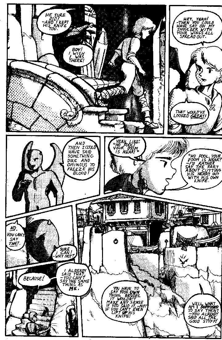 M'Oak clearly got enough positive feedback on his first few issues with text pages that he decided to keep the concept - so he did! Although occasionally still jarring, usually the text pages add incredible depth and reflective capability to the story. It lets characters "feel out loud", it provides verbal descriptions for settings and characters, and it inserts backstory into odd places in the narrative, which at first puzzle the reader then immediately blossom into that wonderful feeling of "Ah-hah! I see now!". Pacing has improved tremendously, with M'Oak proving a deft hand at cliffhangers - now if only he didn't end each paperback collection on a drastic cliffhanger!